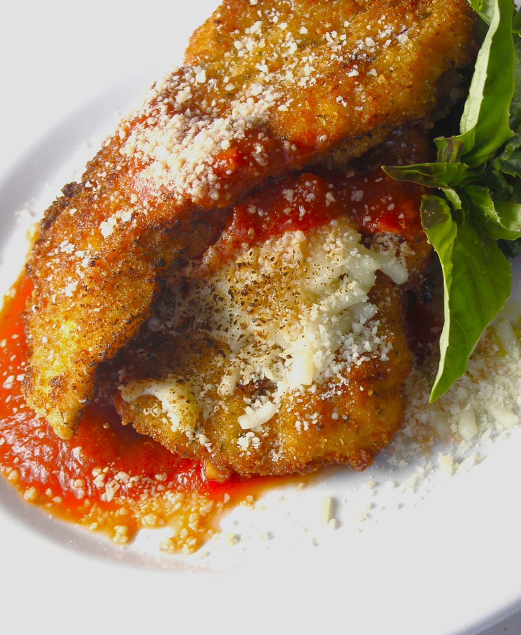 Breaded, hand sliced chicken cutlets topped with a homemade Red Gravy and melted mozzarella and Parmesan cheese.